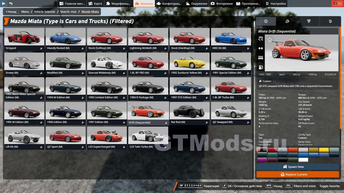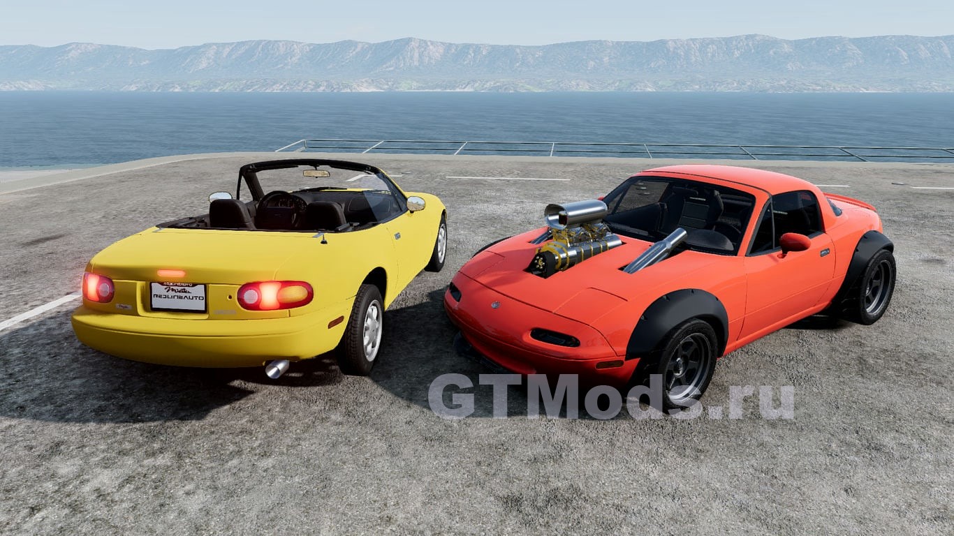 Mazda Miata NA — это оригинальный облегченный родстер Mazda. В мод включен классический 1,8-литровый атмосферный рядный 4-цилиндровый двигатель мощностью около 110 л.с. в заводской комплектации. В мод включены 4 различных варианта двигателя: BP, LS3, 2JZ и 13B роторный.