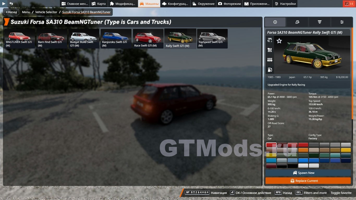 - 7 конфигураций [Swift GTi, Kanjozoku, Race, TopSpeed, BarnFind, BudgetBuild, Rally]