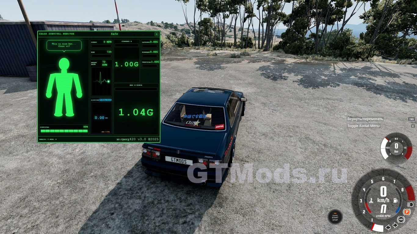 Мод считывает данные об ускорении непосредственно из физического движка BeamNG и преобразует их в перегрузки. Затем он применяет реальные биомеханические модели для оценки вероятности получения травмы: