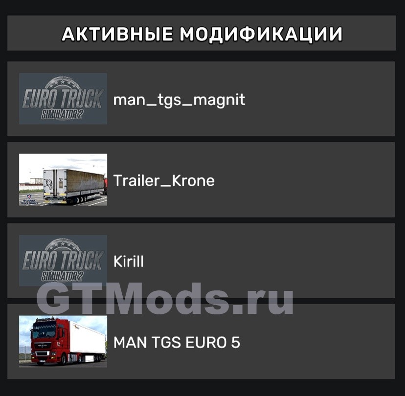 MAN EURО 5 + Прицеп Тандем (ET2 2) v1.0 (1.57.x) 22 январь 2026 1 245 1 60 1 2 3 4 5 МОД включает в себя ман евро 5 тягач и тандем + прицеп.Архив распаковать и подключить в последовательности указанной на фото. Добавил: skufidon1337 Скачать c modsfire 160 мб Похожие модификации: КамАЗ 54-64-65 Зерновоз ETS2 v1.0 Мод Камаз 65207 Тандем + Прицеп v1.0 для Euro Truck Simulator 2 (1.36.x) Мод PWT Thermo Scania R650 Combo для ETS 2 (1.33.x) Мод DAF XF 105 Tandem v1.0 для ETS 2 (1.33.x) Комментарии: SERGEI Комментариев: 0 | Модов: 0 23 января 2026 23:46 skufidon1337 Привет с прицепом тендемом машина не поворачивает в право и в лево без прицепа тендема всё нормально исправьте пожалуйста а так всё нормально кататься можно по ets 2 Ответить Прокомментировать Введите два слова с картинки: Отправить