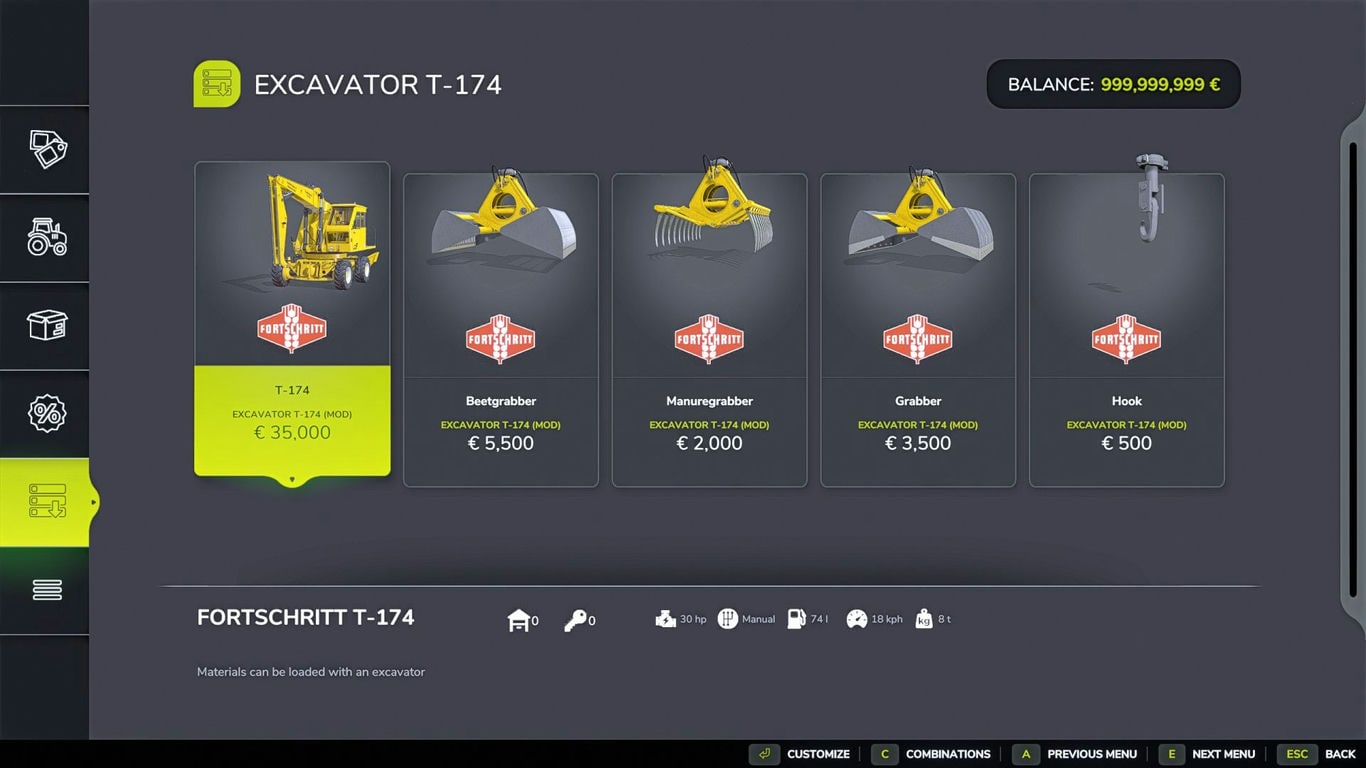 Ферма FORTSCHRITT T174 может использоваться для обработки различных грузов; доступны грейферы для навоза, грейферы для свеклы, грейфер для всех видов грузов и крюк для биг-бэгов.