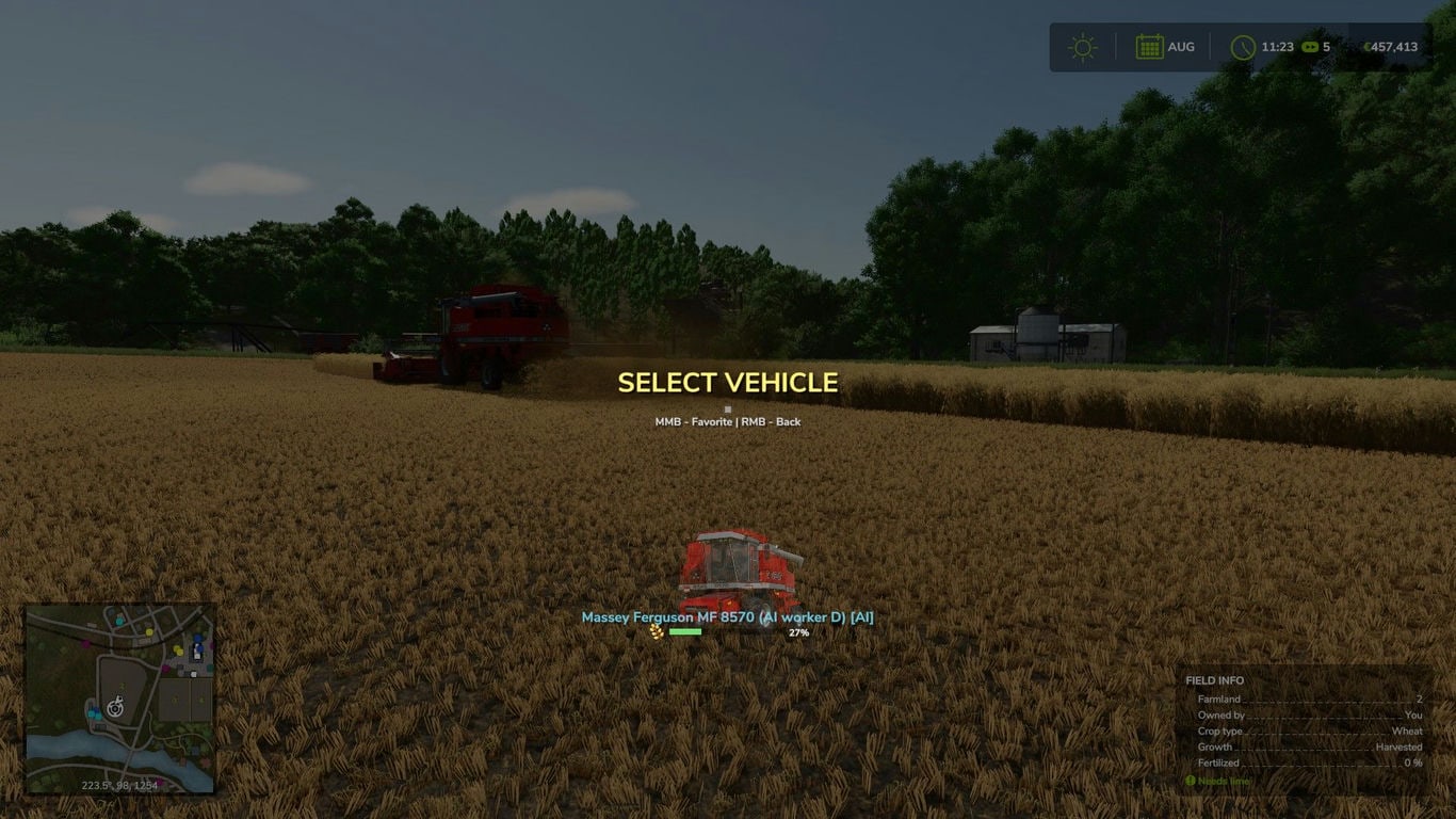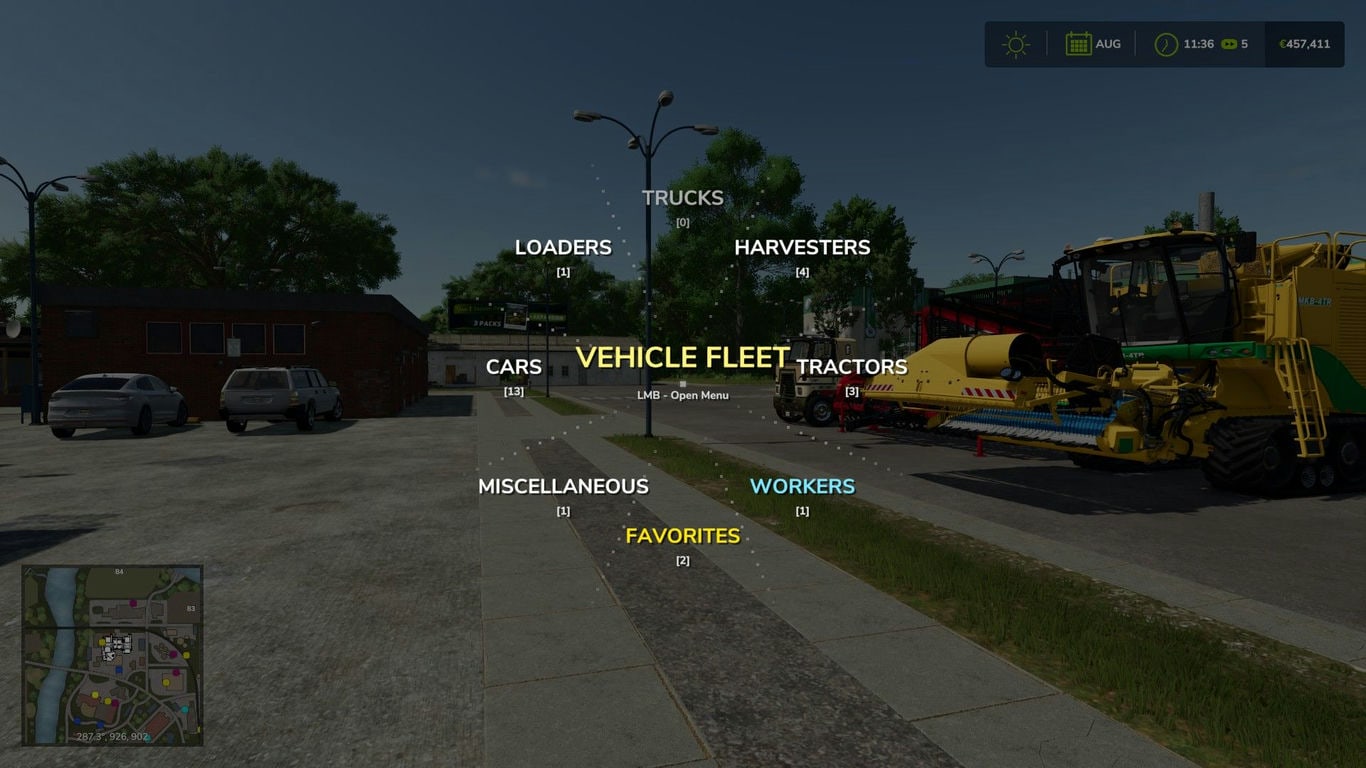 Меню разработано для управления фермой в реальном времени. Транспортные средства, управляемые работниками ИИ, выделяются специальным синим индикатором и группируются в отдельную категорию. Для комбайнов и прицепов в меню отображаются динамические индикаторы уровня заполнения, включая точные проценты, и значки культур, позволяющие мгновенно отслеживать состояние автопарка.