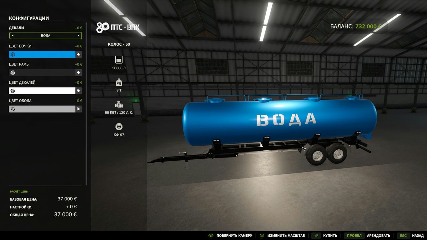 - Выбор декалей: вода, топливо, молоко, жидкие удобрения, гебициды (на русском языке);